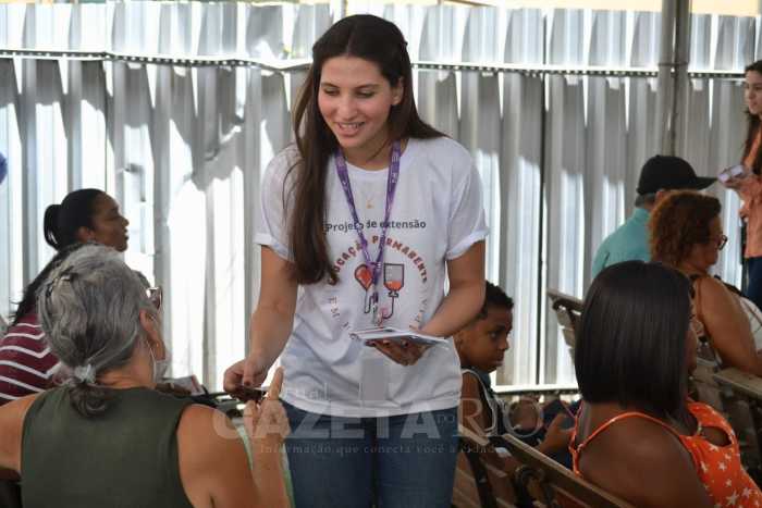 Aluna do projeto de extensão em Educação Permanente em Hemoterapia realizando panfletagem e orientação ao público. Foto: Marcio Curvello | Jornal Gazeta do Rio
