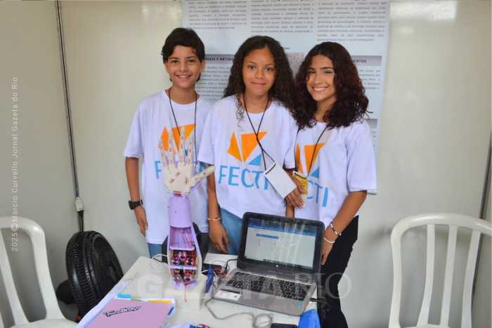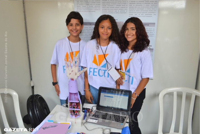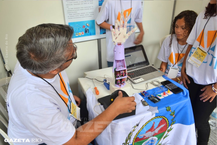 Outro estande visitado pela reportagem foi o do projeto TecnoBraço, da Escola Municipal Dr. Ricardo Augusto de Azeredo Vianna, em Duque de Caxias. Desenvolvido pelos estudantes Gabriel Lucas Fernandes DiasManuela Lyra Auday e Mary Ashley do Nascimento, com orientação do professor Darcio Otaviano Ranauro e coorientação de Hugo Leonardo do Valle, o trabalho apresentou um braço robótico controlado por sinais mioelétricos, com foco na inclusão e na mobilidade de pessoas com deficiência no ambiente educacional.