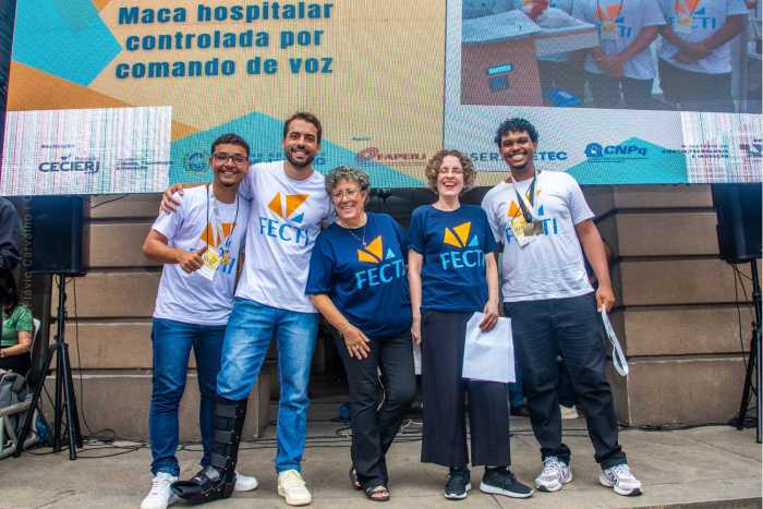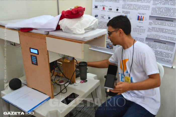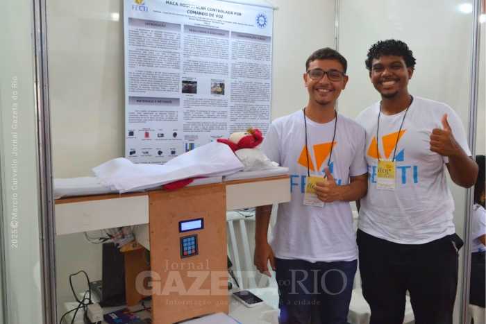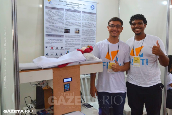 A reportagem também acompanhou a apresentação do projeto “Maca Hospitalar Controlada por Comando de Voz”, desenvolvido pelos estudantes Cauã Da Cal Azevedo de Carvalho e João Marcelo Moura Lopes, da Escola Técnica Estadual Henrique Lage (Faetec), em Niterói, sob orientação do professor Altair Martins dos Santos. O sistema utiliza reconhecimento de voz para permitir que pacientes realizem ajustes da maca hospitalar de forma autônoma. Além de expositor, o projeto foi um dos premiados da XIX Fecti, na categoria Desenvolvimento de Tecnologia, evidenciando o impacto prático da proposta.