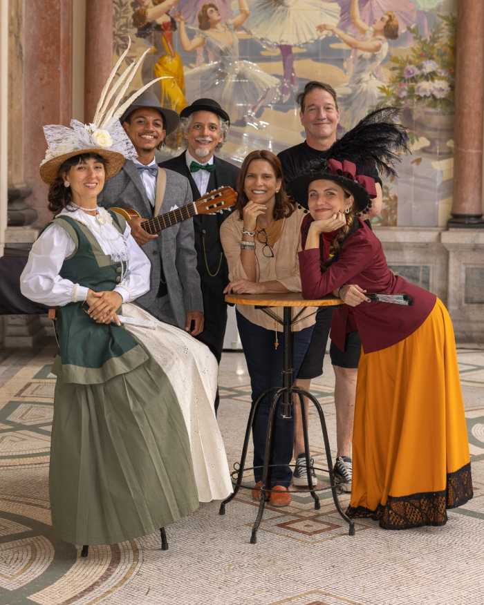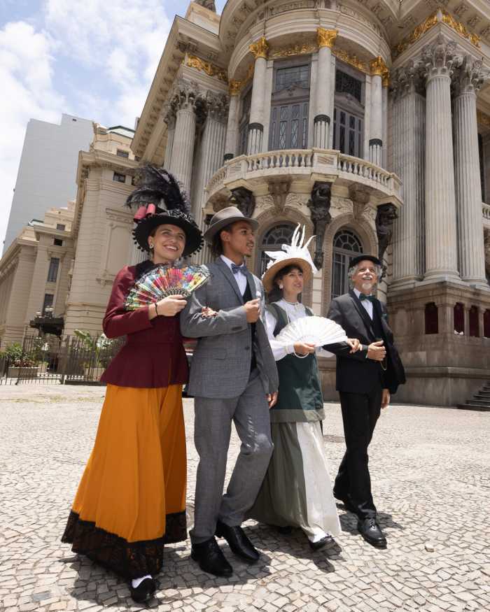 Elenco “Theatro Municipal Conta Histórias”. Foto: Divulgação A visita teatralizada “Theatro Municipal Conta Histórias” convida o público a percorrer os salões e corredores do edifício centenário enquanto personagens e cenas recriam episódios marcantes da história do teatro e da cidade.