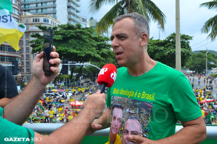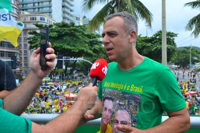 Deputado Anderson Moraes em entrevista a Jovem Pan durante a manifestação em Copacabana. Foto: Marcio Curvello | AMC PHOTOPRESS