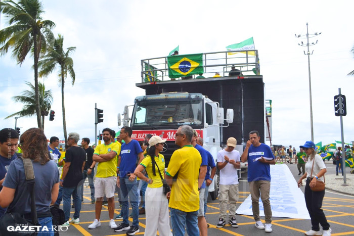 Rio de Janeiro (RJ) — Manifestantes se reuniram neste domingo (1º) na Avenida Atlântica, na Praia de Copacabana, Zona Sul do Rio, durante o ato intitulado “Acorda Brasil”. A mobilização começou por volta das 10h e seguiu até o início da tarde, reunindo apoiadores com bandeiras do Brasil, faixas e cartazes.