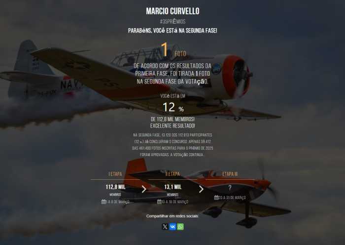 Rio de Janeiro (RJ) — A fotografia “Parallel Skies”, do fotojornalista carioca Marcio Curvello, avançou para a segunda fase do concurso internacional de fotografia “11th 35AWARDS”, na categoria Movement. O registro foi realizado durante o MUSAL Air Show 2025, evento promovido no Museu Aeroespacial (MUSAL), no Rio de Janeiro.